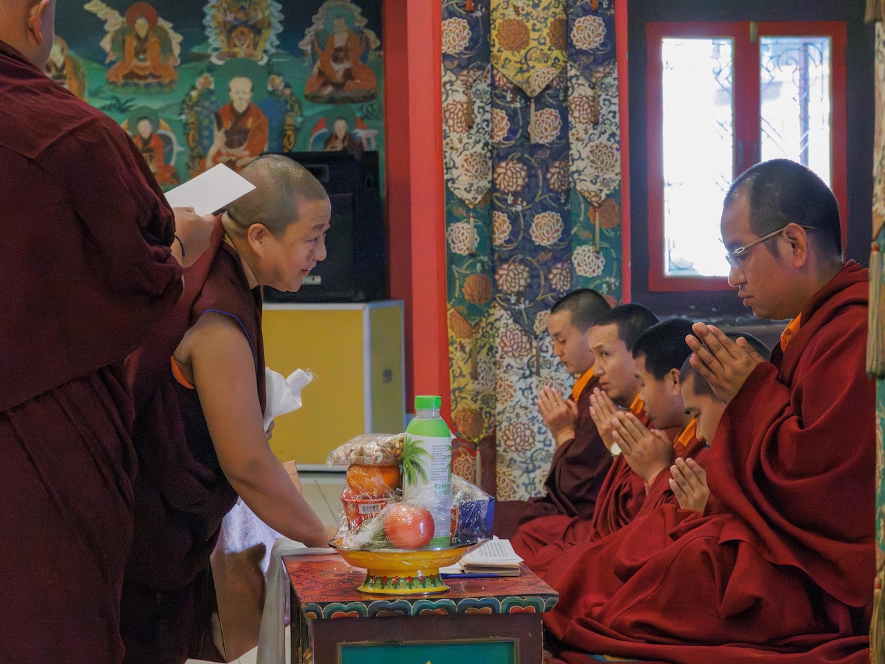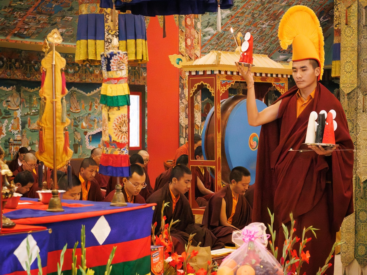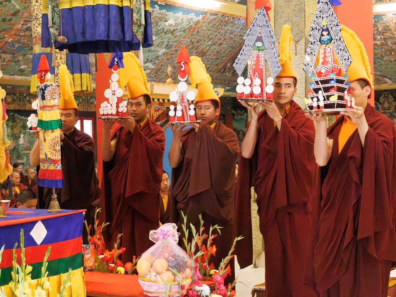 L’assemblée, conduite par Minling Dungsé Rinpoché, réunissait Minling Jetsun Rinpoché, Minling Jetsun Khandro Rinpoché, Minling Jetsun Dechen Paldron, Sangyum Kushog, le vénérable Khentrul Marpa Rinpoché, ainsi que les autres tulkous, khenpos et moines de Mindrolling, les nonnes de Samten Tse et les membres de la sangha internationale.